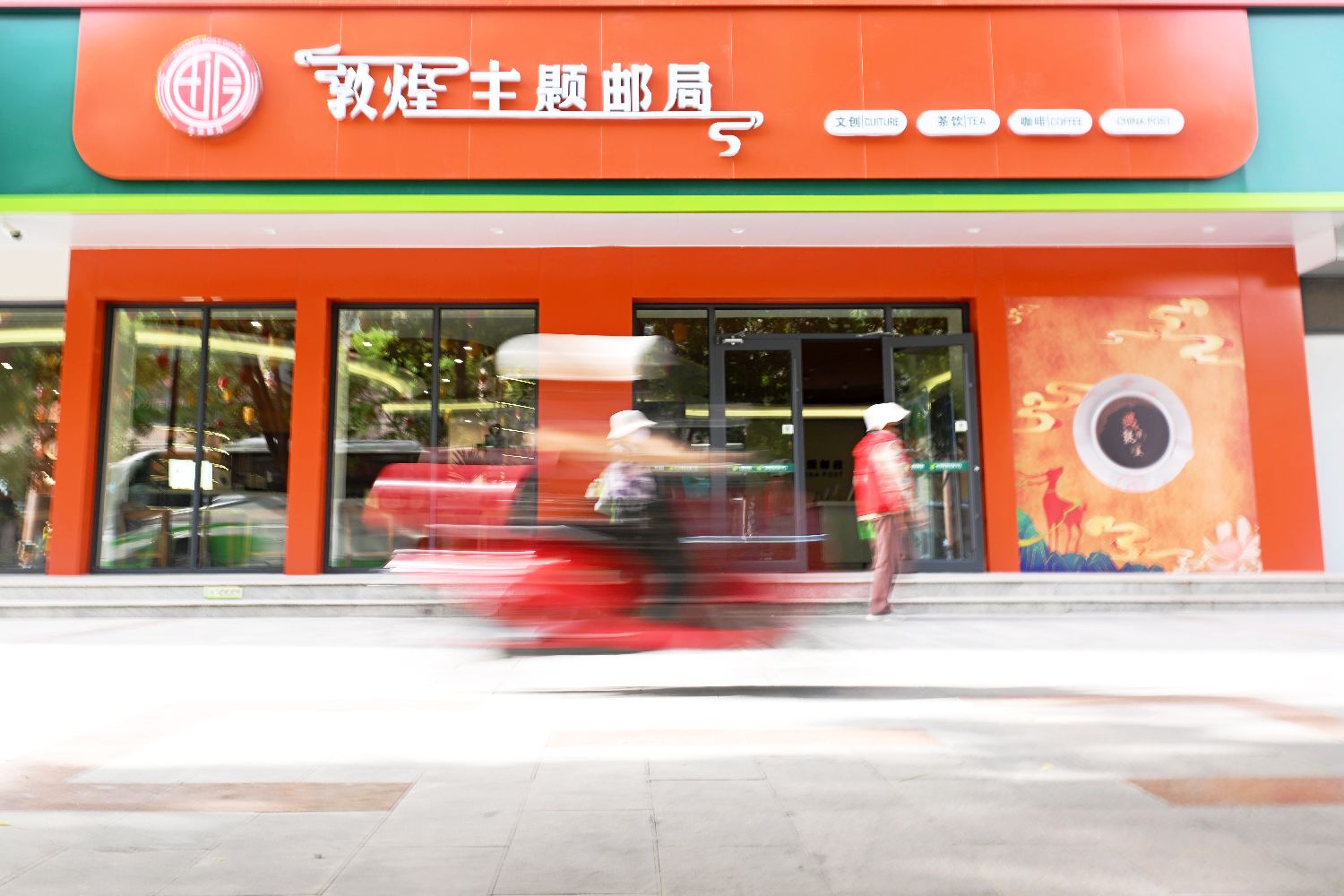 据介绍,随着文旅市场需求日益多元化,敦煌近年相继设置敦煌书局、敦煌印局、敦煌飞天主题邮局,以及筹备中的敦煌酒局,正不断满足游客的深度体验需求。图为5月22日,民众经过甘肃敦煌飞天主题邮局。(图片来源:中新社)