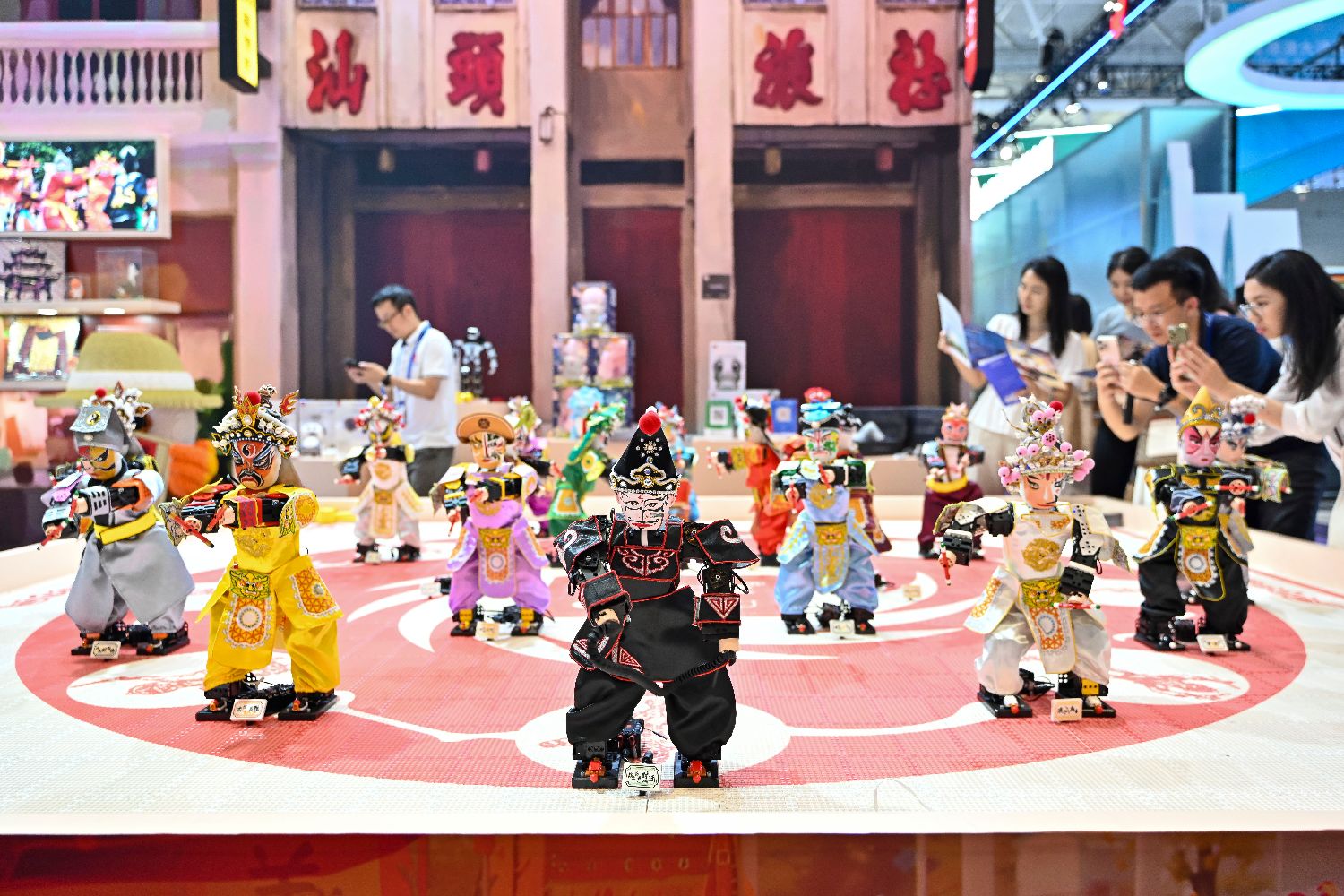 本届文博会共设八大展馆,展出文化产品超12万件,并首次设立人工智能展区。全场60多家人工智能领域知名企业参展,通过实物展示和互动体验,让参观者直观感受人工智能技术的魅力和应用前景。图为机器人进行英歌舞表演吸引参观者。