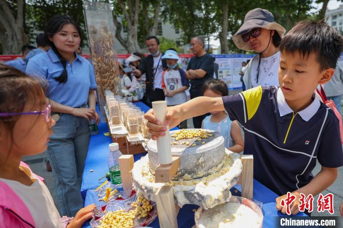 图为5月25日,孩子们在南京农业大学用石磨体验磨豆子。(图片来源:本文图片均来自中新网)