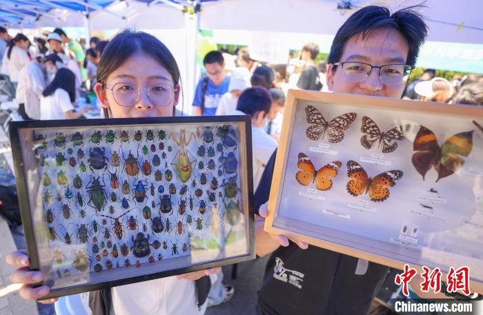 图为5月25日,南京农业大学植物保护学院的学生展示蝴蝶和昆虫标本。