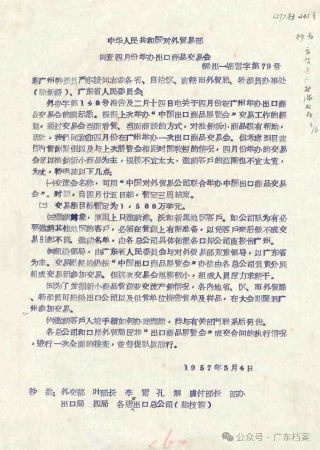 《中华人民共和国对外贸易部同意四月份举办出口商品交易会》的文件(1957年3月4日)。(图片来源:广东省档案馆供图 中新社发)