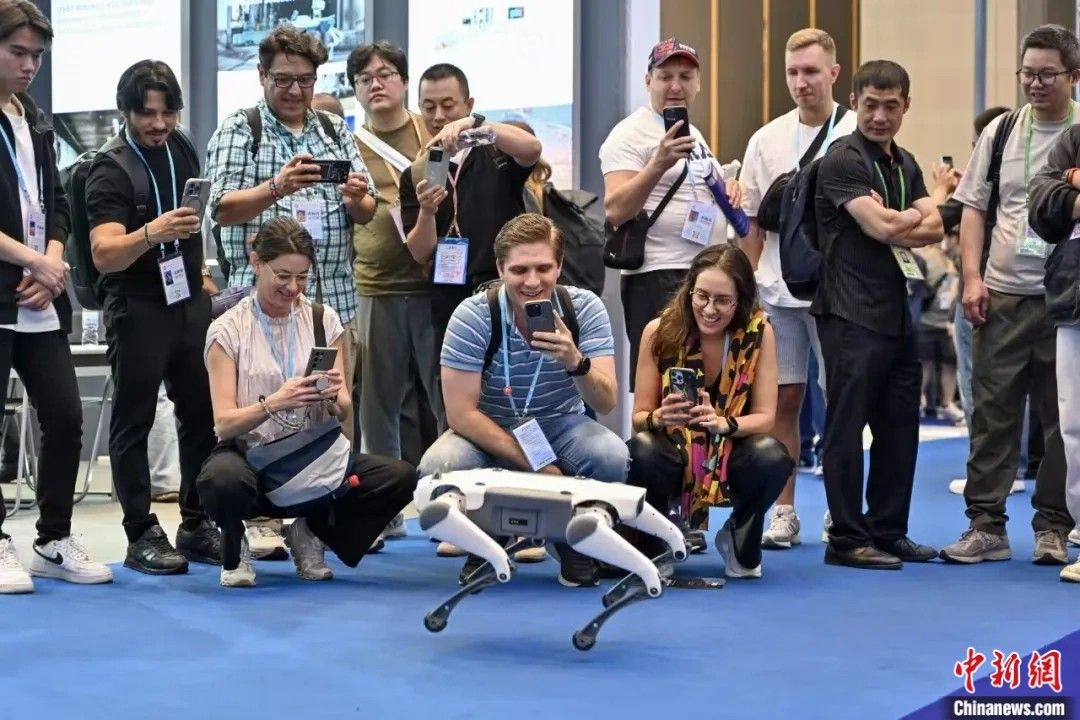 4月15日,第137届广交会增设服务机器人专区,集中展示中国人工智能发展最新成果。图为一款四足机械狗吸引采购商。(图片来源:中新社)