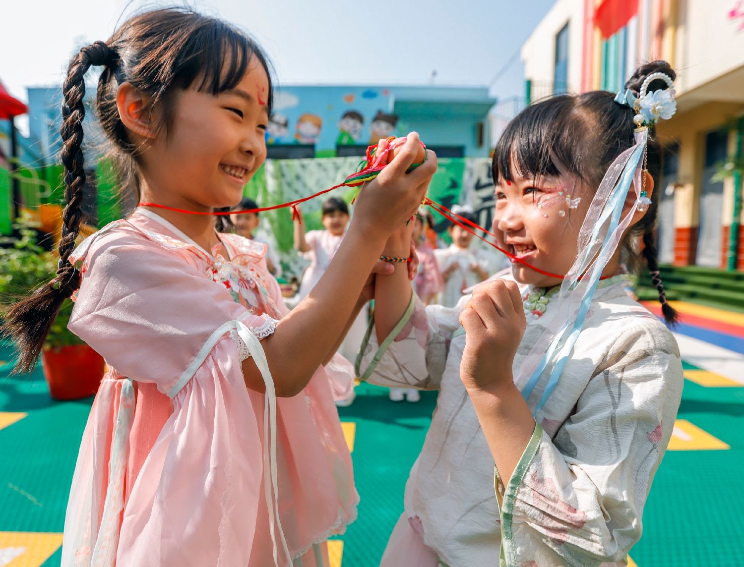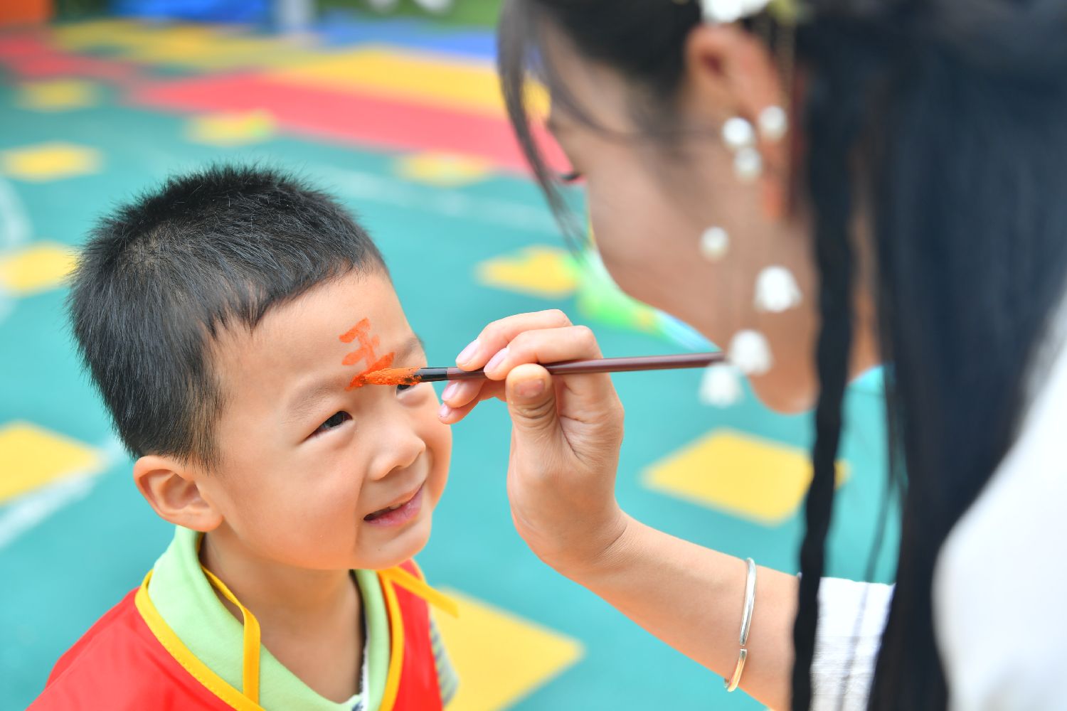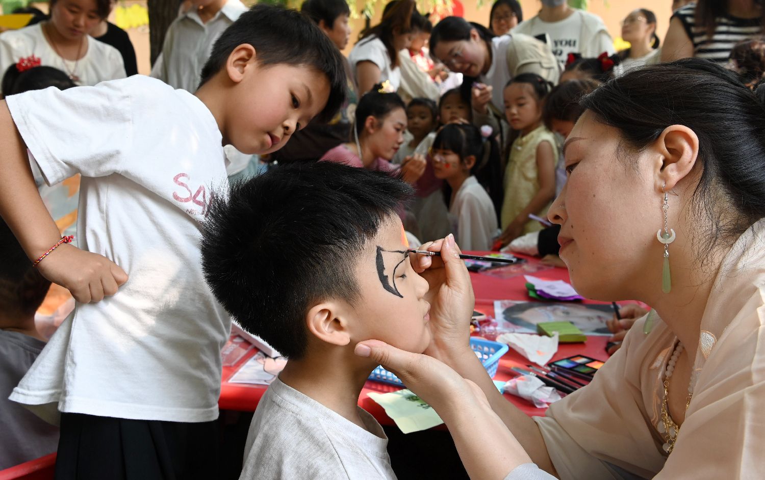 5月28日,在河南省沁阳市白庄村幼儿园,老师为小朋友画面部彩绘。(图片来源:本文图片均据新华社)
