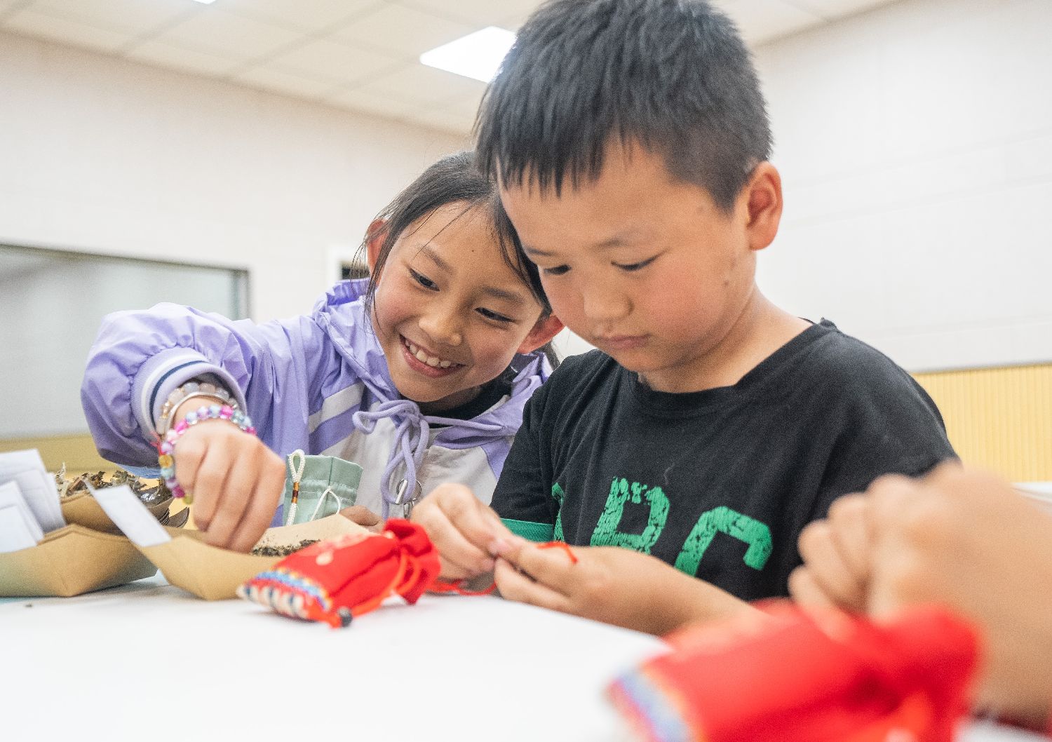5月27日,贵州省毕节市七星关区甘河街道中心校的孩子们在老师指导下制作香囊。