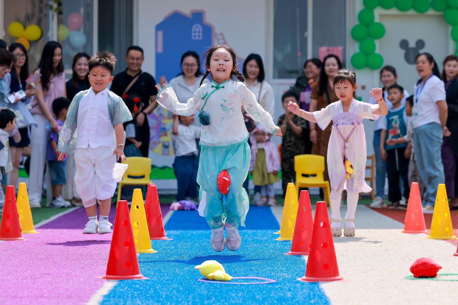5月28日,在山东省枣庄市薛城区长江路幼儿园,小朋友玩“夹娃娃”游戏。
