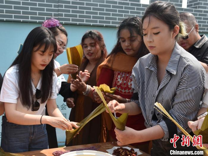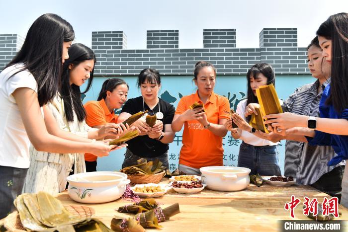 游客体验包粽子。