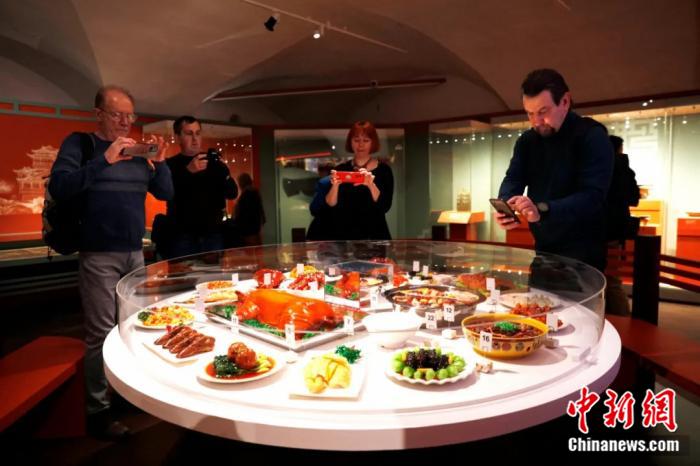 4月10日,“食味中华——中华古代饮食文化展”在俄罗斯首都莫斯科克里姆林宫博物馆开幕。图为俄罗斯媒体记者拍摄展品。(图片来源:中新社)