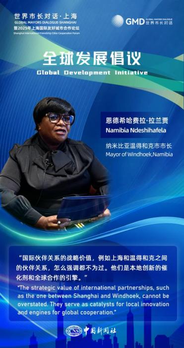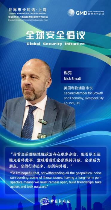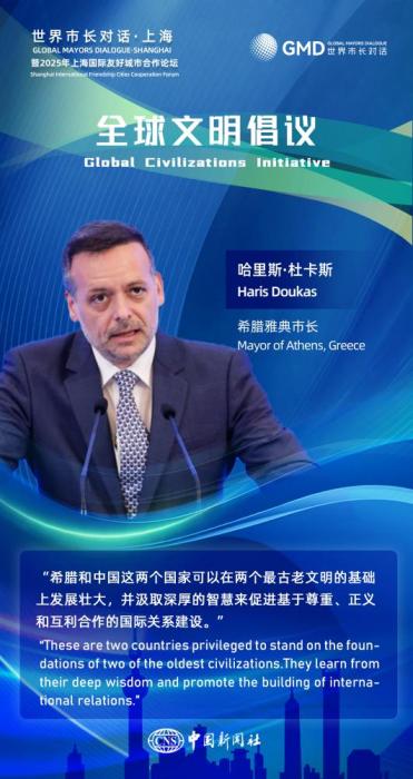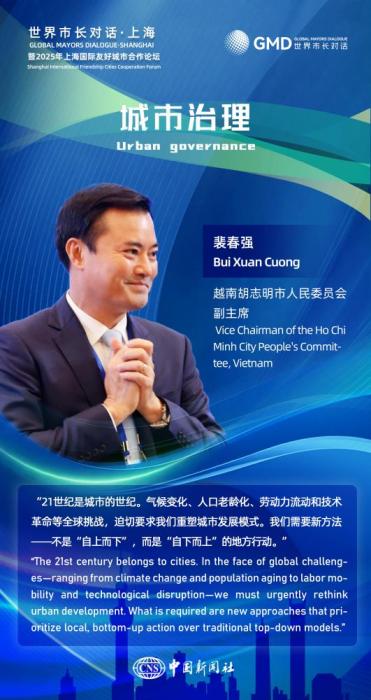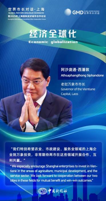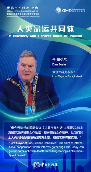 图为友城市长在2025年上海国际友好城市合作论坛活动中的金句海报。(图片来源:中新社宋烨姗 制图)