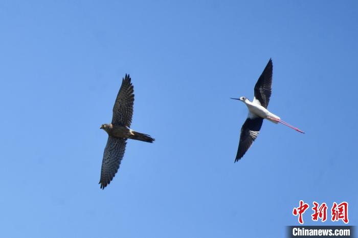 6月3日,一只黑翅长脚鹬在驱赶进入孵化领地的红隼。(图片来源:本文图片均据中新网)
