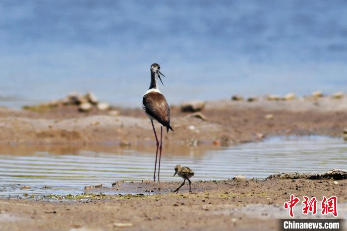 6月3日,一只黑翅长脚鹬鸟妈妈在水边“遛娃”。