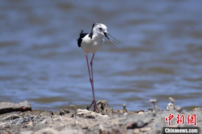 6月3日,一只黑翅长脚鹬在水边呼唤鸟宝宝。
