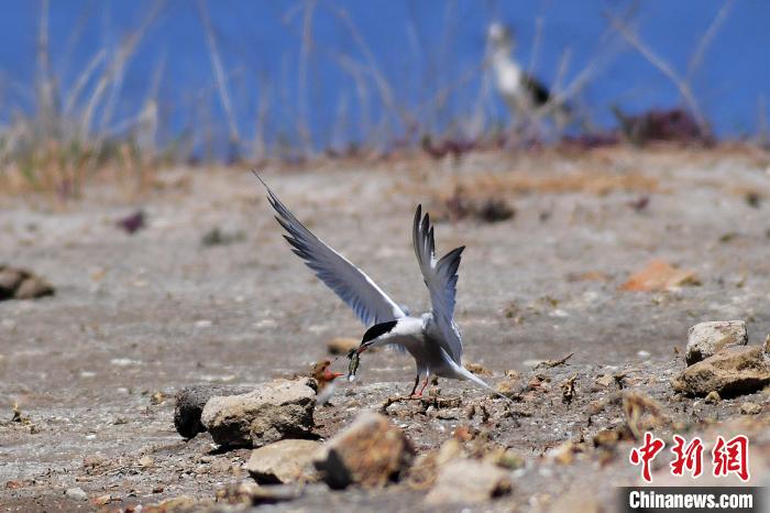 6月3日,一只燕鸥衔来小鱼喂养鸟宝宝。