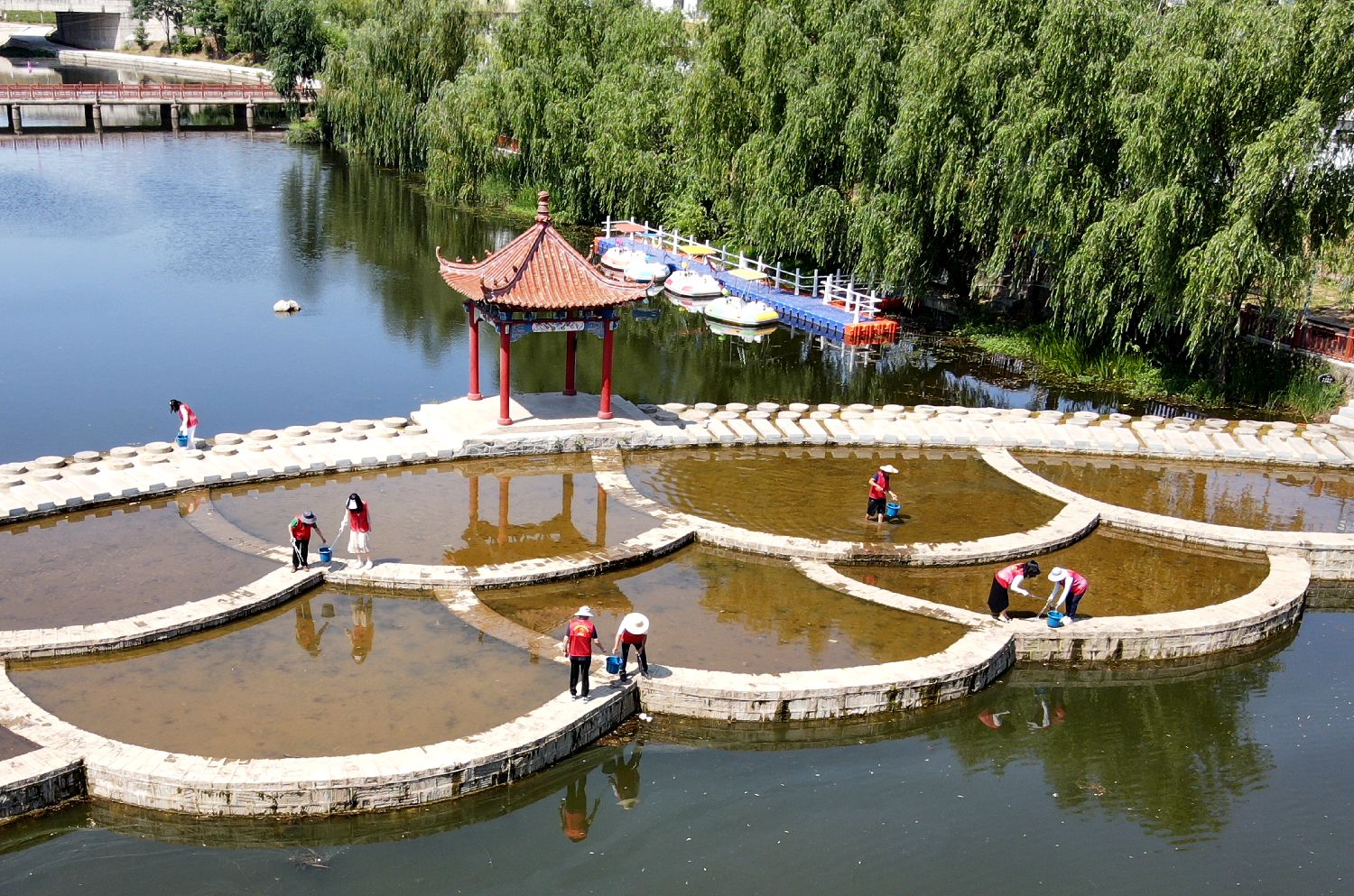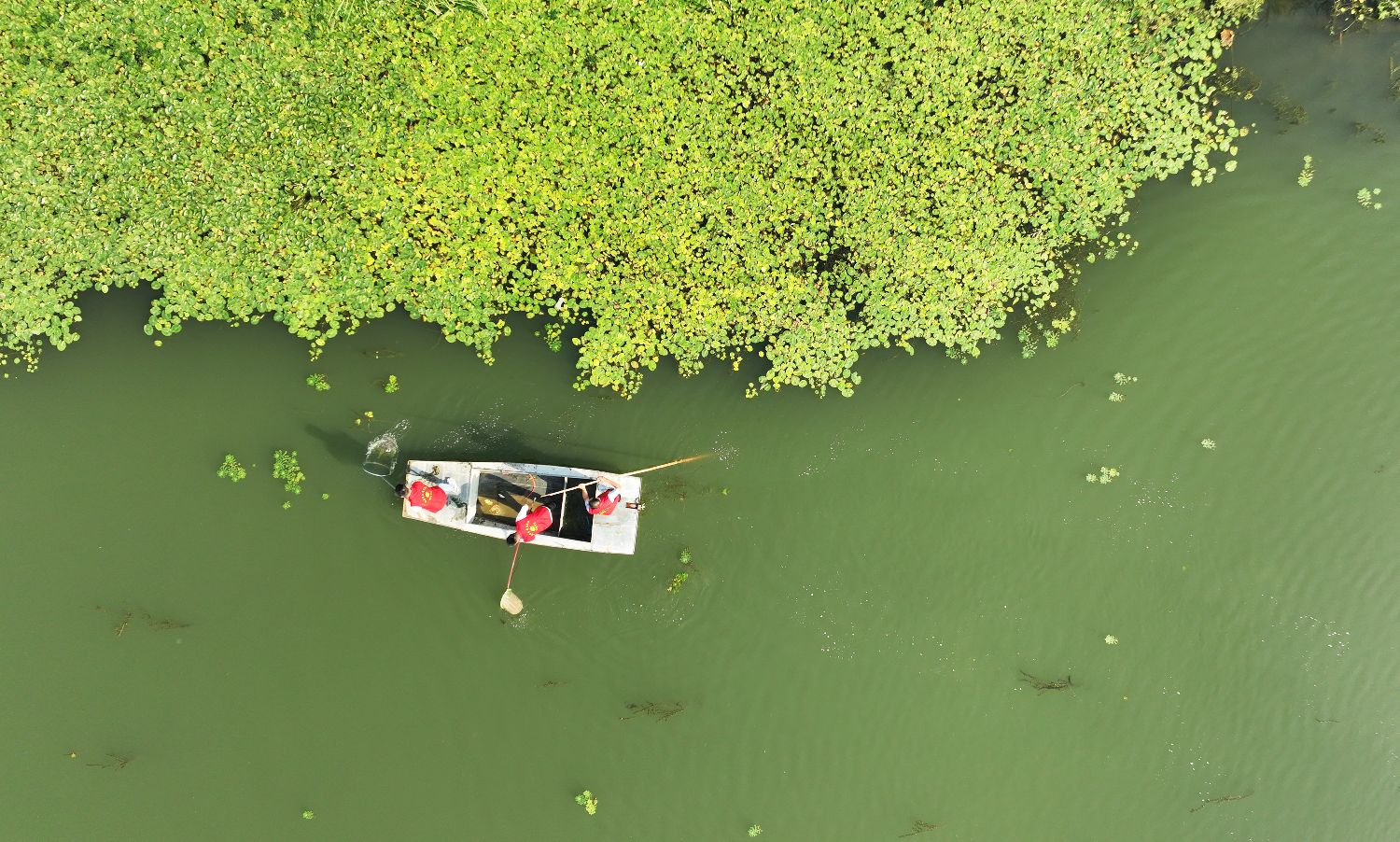6月4日,山东省临沂市郯城县郯城街道十里村党员志愿者在白马河湿地公园清理打捞水面漂浮物(无人机照片)。