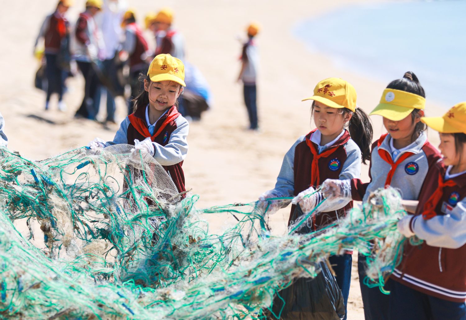 6月4日,山东省荣成市滨海公园,小学生们在清理海滩垃圾和海洋漂浮物。