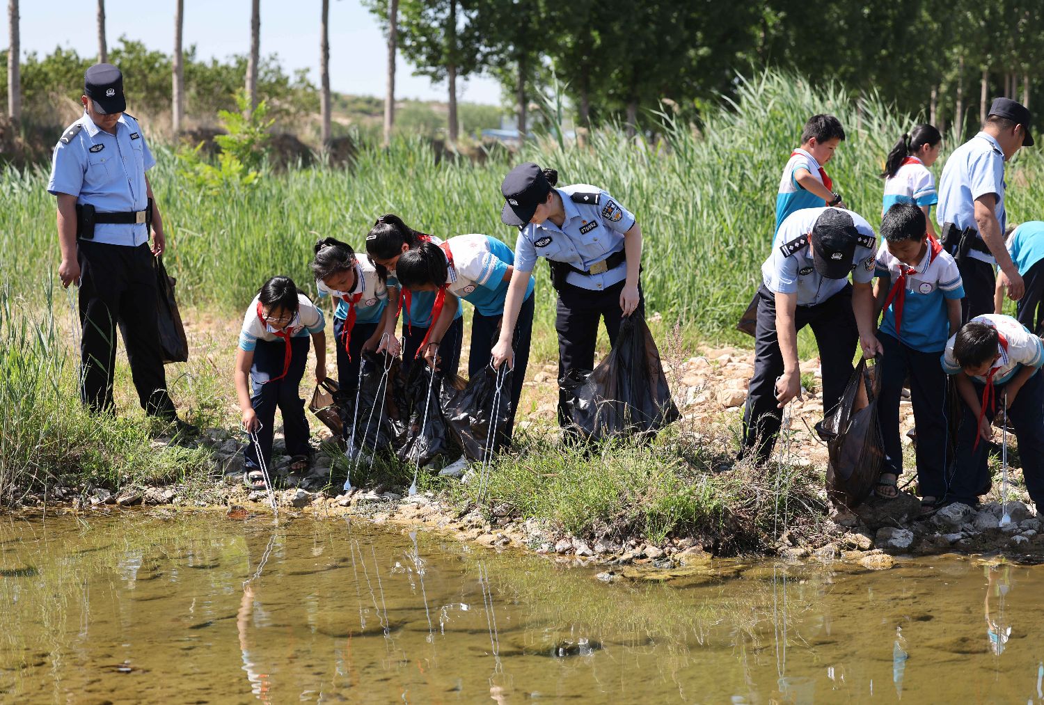 6月4日,山东省临沂市沂南县公安局马牧池派出所民警携手沂南换于红军小学的“红领巾环保志愿者”在王家河流域清理杂物。