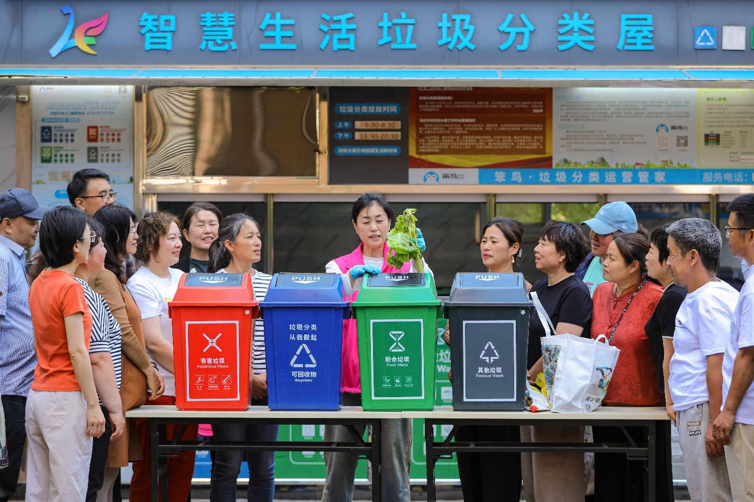 6月4日,在山东省青岛市李沧区浮山路街道旭东社区,宣讲员为居民讲解垃圾分类知识。
