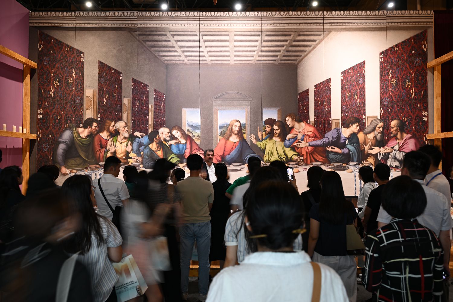 展览包含达·芬奇手稿设计还原实物23组,海内外古书籍原件6组,数字修复与重建手稿74组,数字修复艺术作品4组,达·芬奇作品真迹1件;其中巨型攻城塔、巨型攻城弩等11组古代中西发明模型首度亮相。图为策展人向观众介绍达·芬奇壁画《最后的晚餐》的1:1数字化复原场景。(图片来源:中新社)