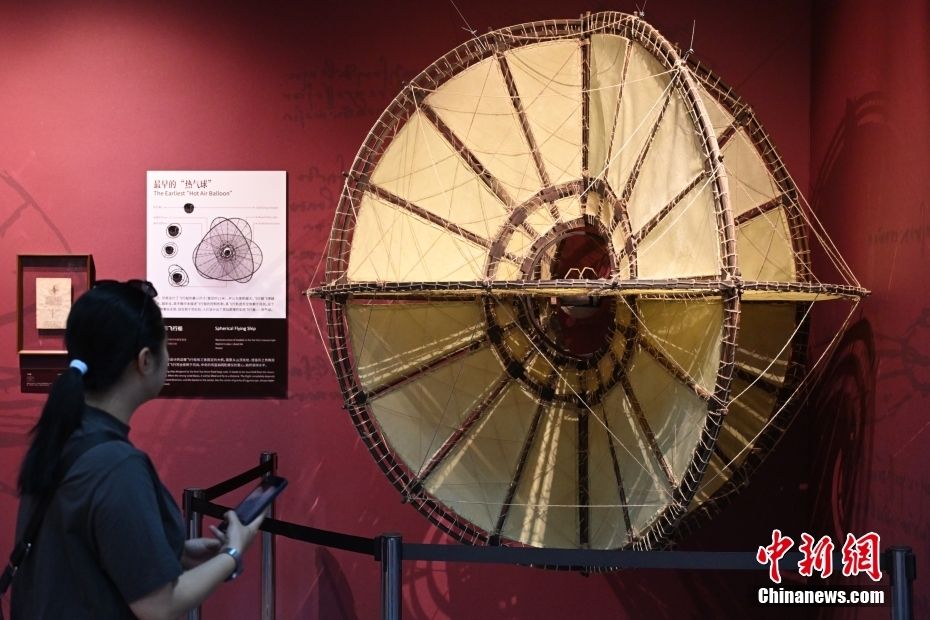 参观者观看达·芬奇手稿中的模型重建“球形飞行船”模型。(图片来源:中新网)