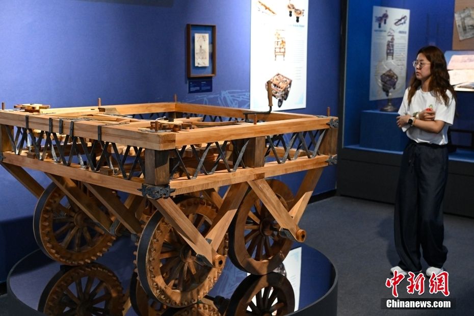 参观者观看达·芬奇手稿中的模型重建“自动机械车”模型。(图片来源:中新网)