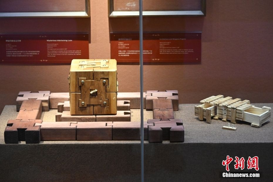展览展出的达·芬奇手稿中的模型重建“神秘魔法盒子”模型(左)与古代中国发明——鲁班锁模型(右)。(图片来源:中新网)