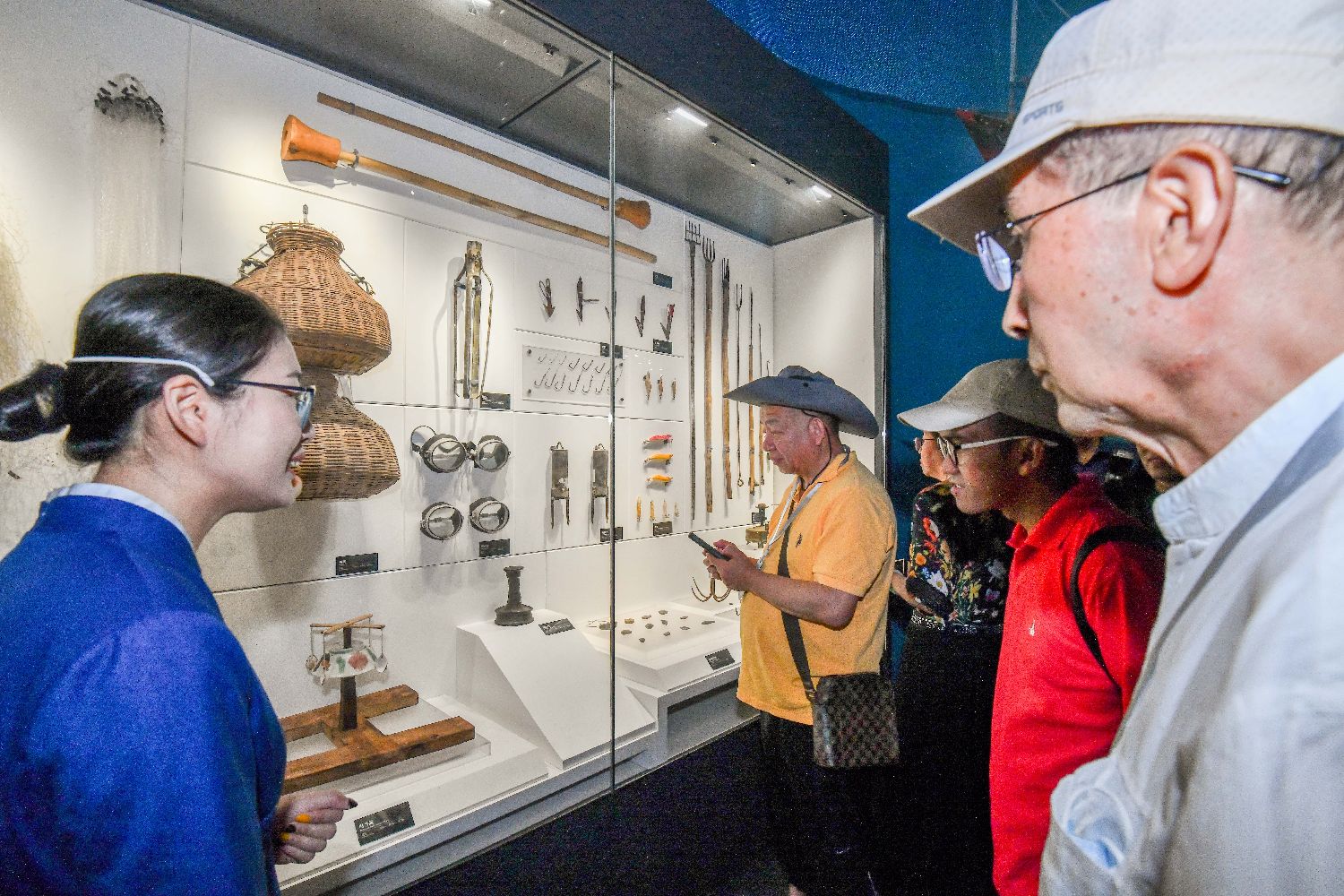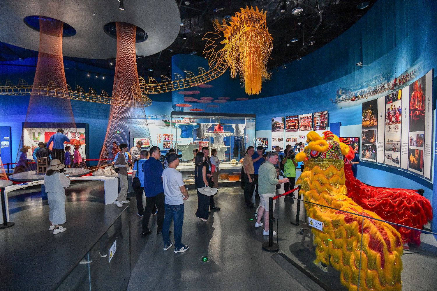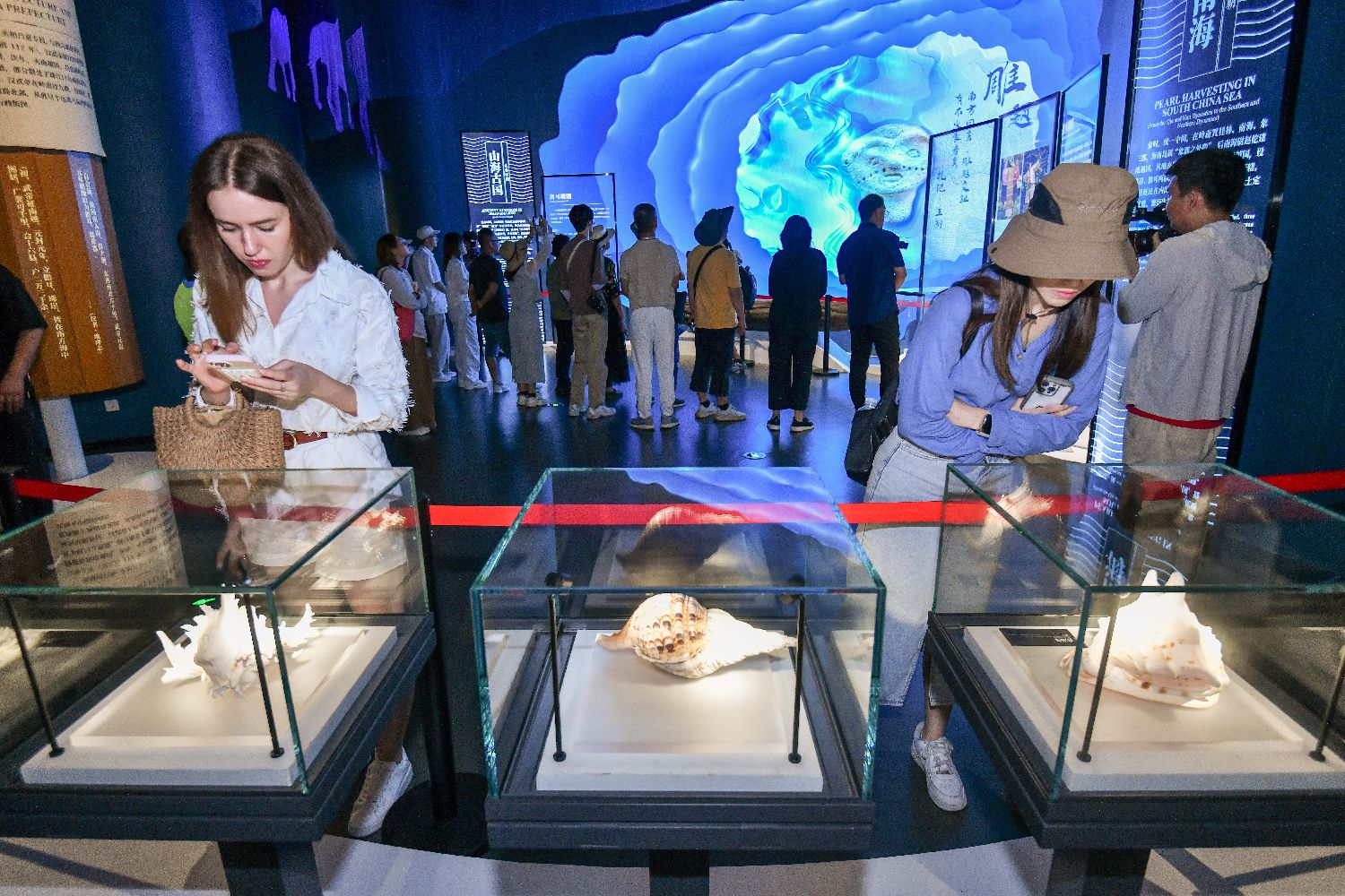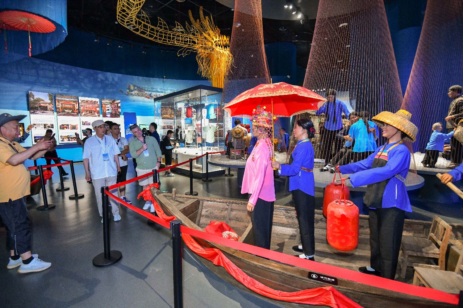 海南疍家博物馆占地约2万平方米,展出360件(套)文物展品,生动讲述疍家人这个“视水为陆、以舟为室”的水上族群的源起与发展、独特生存方式、民俗风情以及文化新貌,成为了解疍家文化与海洋文化的重要窗口。图为6月8日,游客在海南疍家博物馆内参观。(图片来源:本文图片均自中新社)