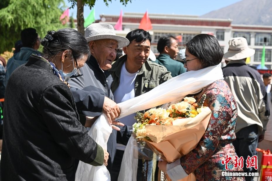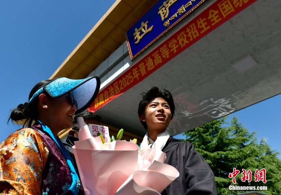 图为家长在西藏拉萨中学考点外为结束考试的孩子献鲜花。