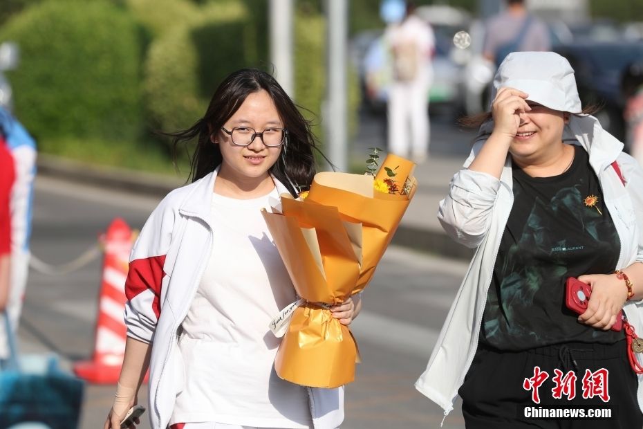 图为在北京中国人民大学附属中学朝阳学校(东校区)考点外,考生手捧鲜花离开考点。