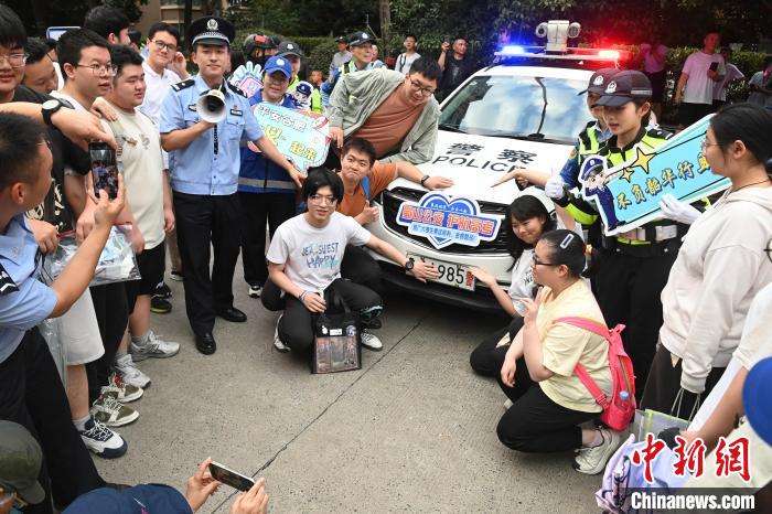 图为在安徽合肥市第八中学考点,学生在带有“985”数字的警车前打卡拍照。