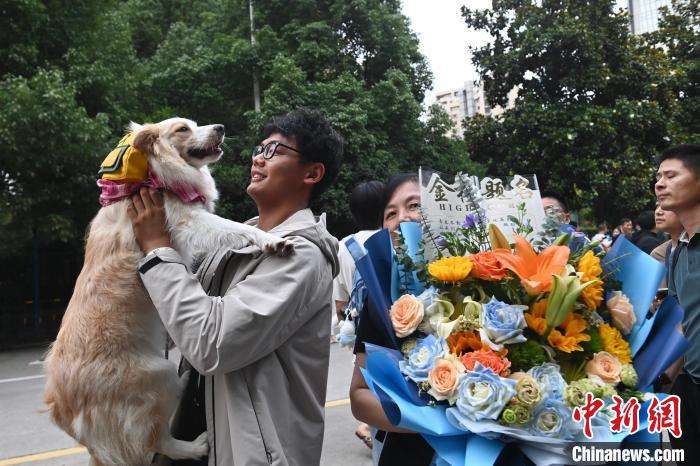 图为在安徽合肥市第八中学考点,一名考生举起等候自己的宠物狗。