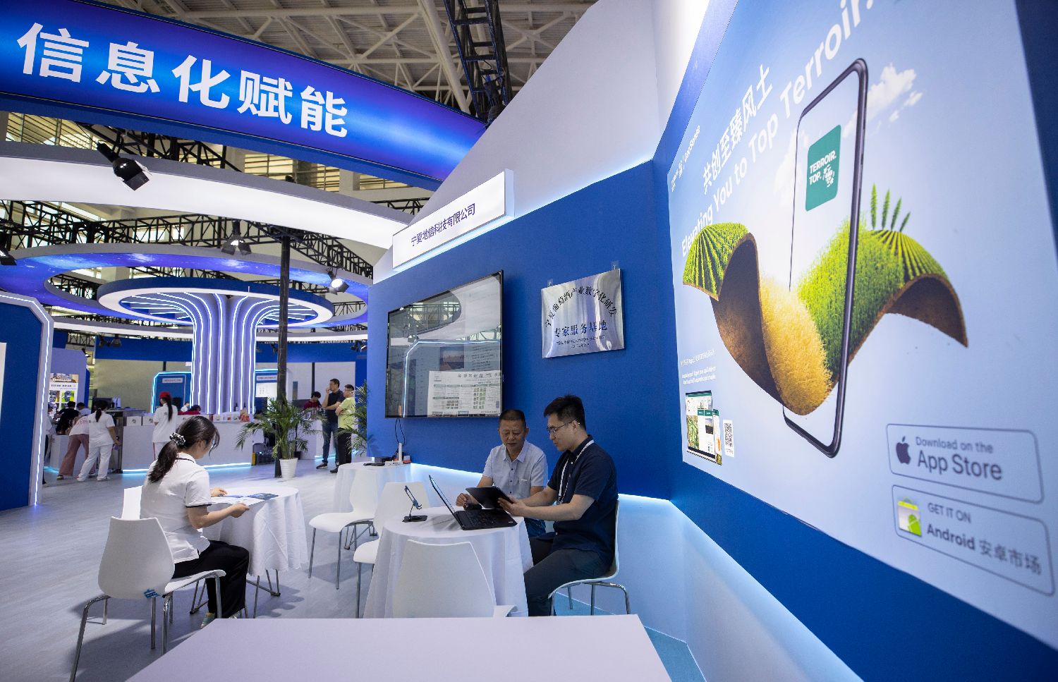 6月11日,在银川国际会展中心举办的第五届中国(宁夏)国际葡萄酒文化旅游博览会上,参展商(右)在介绍智慧葡萄园数字化产品。