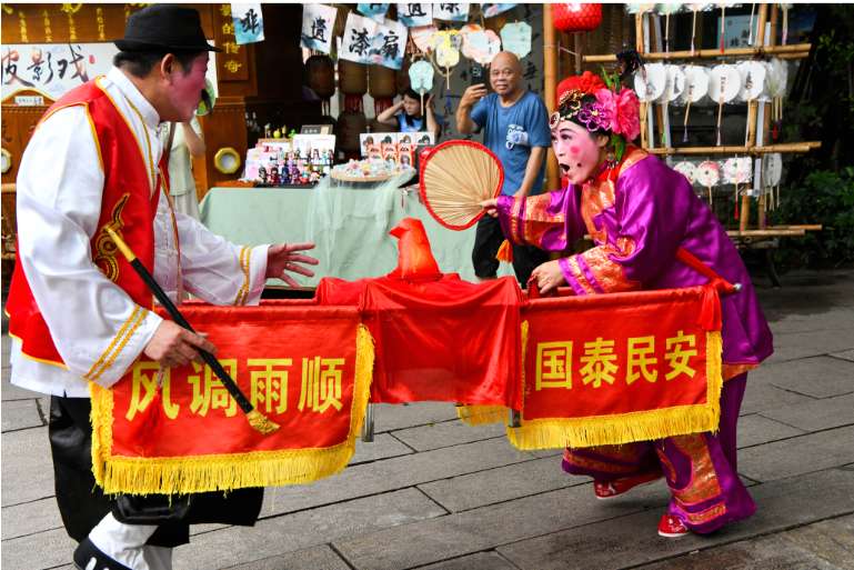 6月14日,2025年“文化和自然遗产日”福建非遗主会场活动在福建福州上下杭历史文化街区启幕。图为吴润珠(右一)与丈夫陈建纯正在进行“火鼎公婆”表演。(图片来源:中新社)
