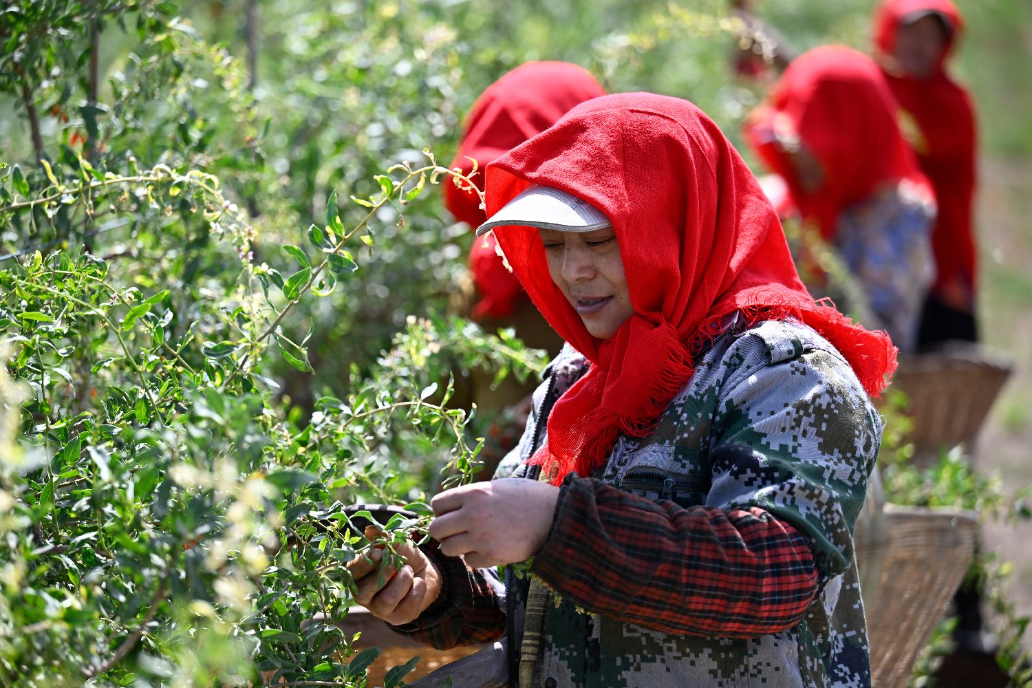 6月15日,采摘工在百瑞源殷红子熟枸杞庄园采摘头茬枸杞。