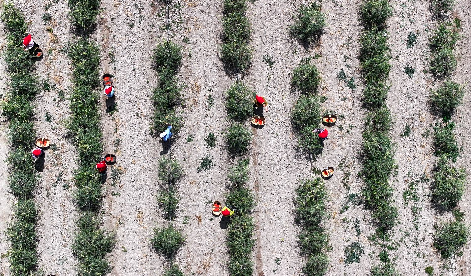 6月15日,采摘工在百瑞源殷红子熟枸杞庄园采摘头茬枸杞。(图片来源:本文图片均据新华社)