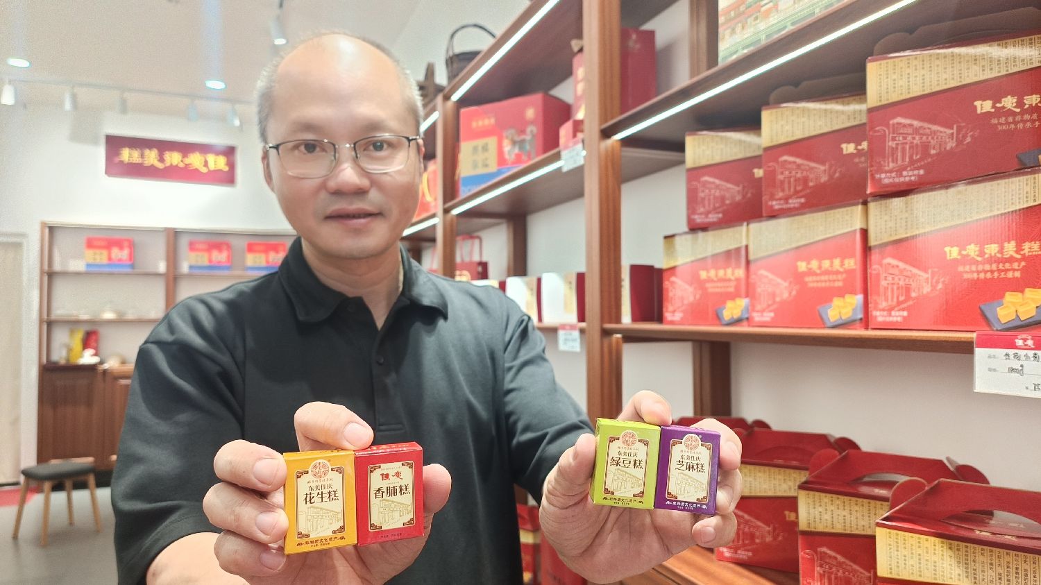 近日,徐源裕在漳州市芗城区的东美糕专卖店内介绍东美糕。(图片来源:中新社)
