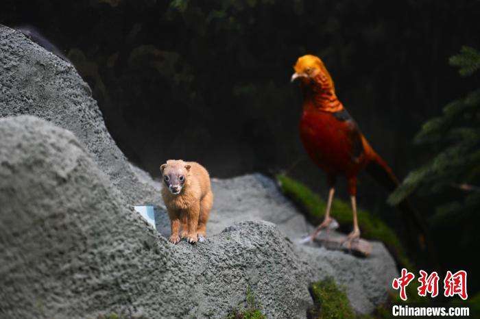 6月16日,在位于甘肃省张掖市肃南裕固族自治县的祁连山国家公园自然博物馆展陈的黄鼬标本(左)。