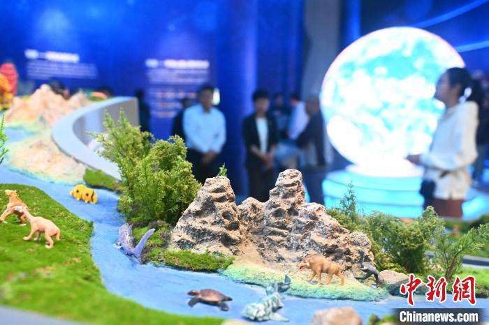 6月16日,在位于甘肃省张掖市肃南裕固族自治县的祁连山国家公园自然博物馆内,游人参观祁连山动植物演化沙盘模型。