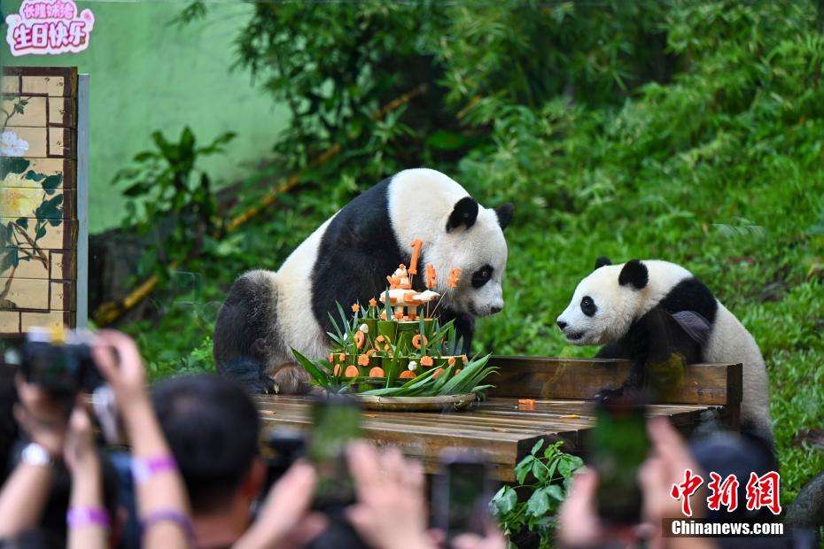 图为6月18日,大熊猫“妹珠”与母亲“萌萌”品尝特制生日蛋糕。