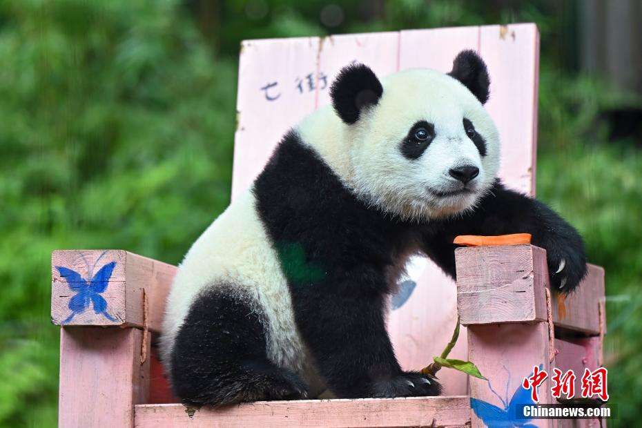 图为6月18日,大熊猫“妹珠”在椅子上玩耍。