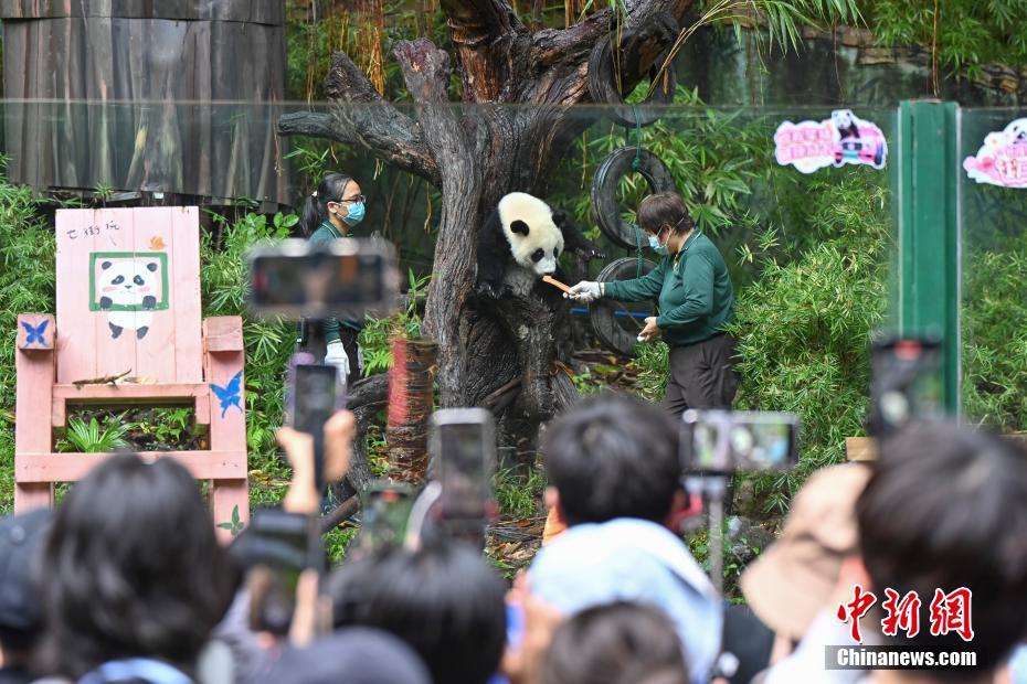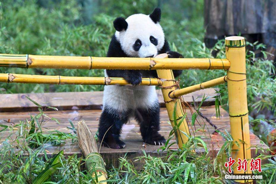 图为6月18日,丰容玩具吸引大熊猫“妹珠”。