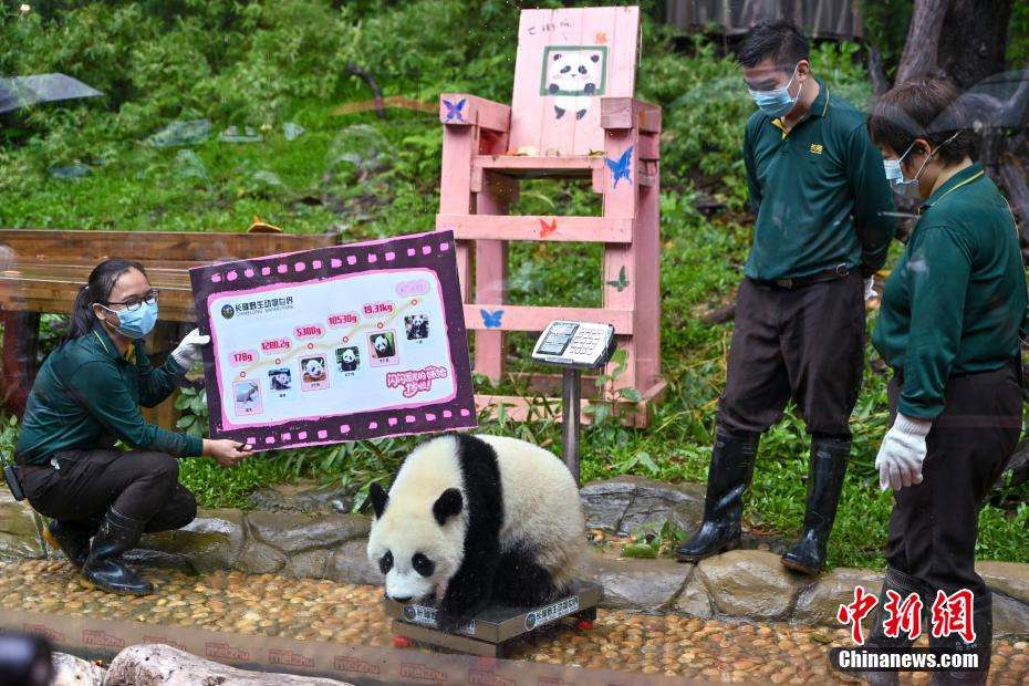 图为6月18日,保育员为大熊猫“妹珠”称体重。