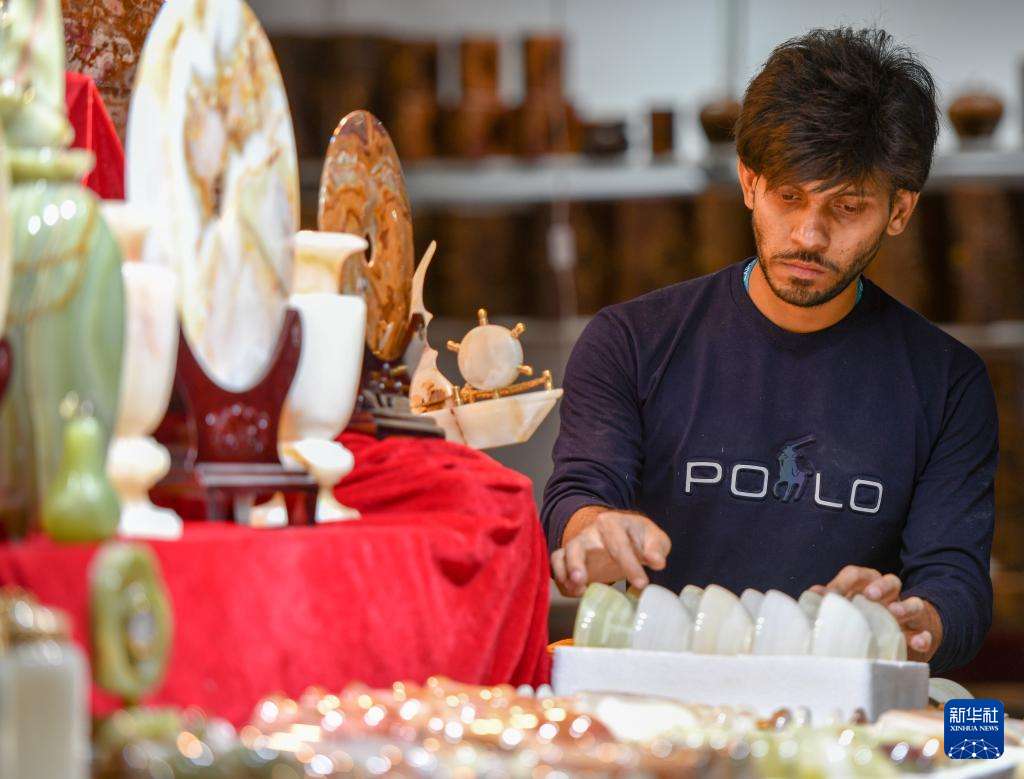 图为6月18日,来自巴基斯坦的参展商在展区内摆放玉石工艺品。