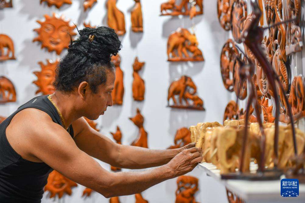 图为6月18日,来自斯里兰卡的参展商在展区内摆放木雕工艺品。