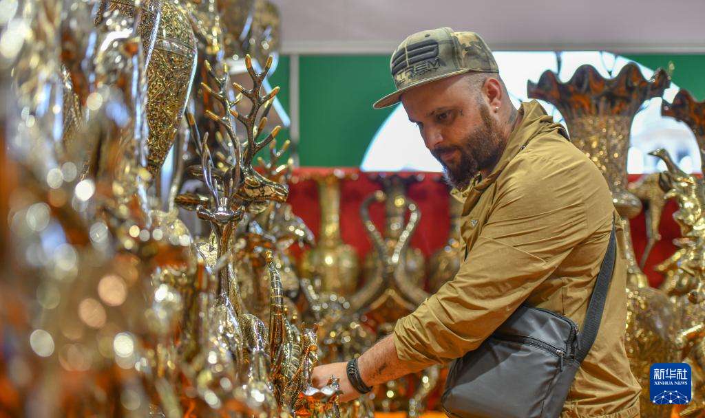 图为6月18日,来自巴基斯坦的参展商在展区内摆放工艺品。