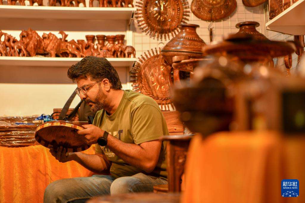 图为6月18日,来自巴基斯坦的参展商修饰即将展出的木雕工艺品。