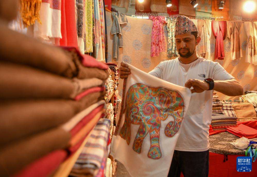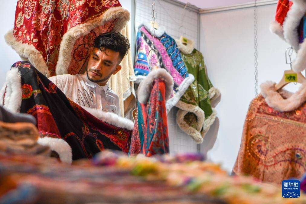 图为6月18日,来自尼泊尔的参展商整理即将展出的特色服饰。