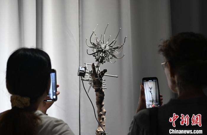 图为6月18日,金属机械和枯木嫁接的《枯木逢春》吸引参观者。(图片来源:本文图片均据中新网)