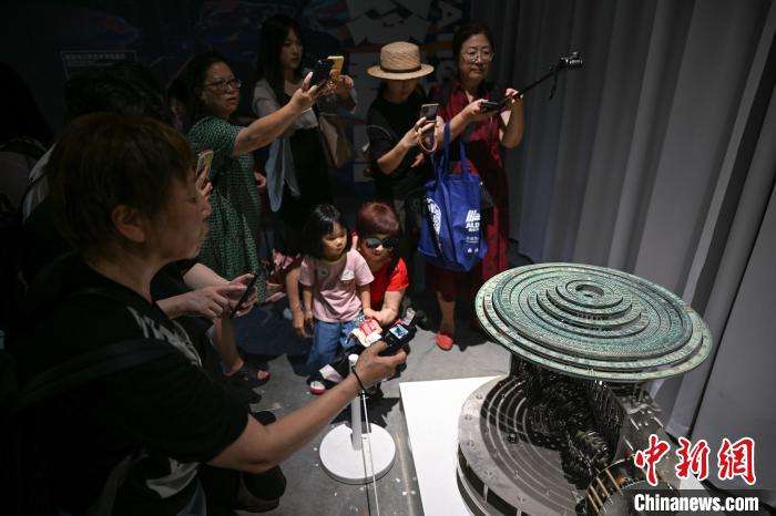 图为6月18日,融入中国篆文和罗盘等元素、通过机械传动方式模拟水滴落水形成涟漪波动的《滴动仪》吸引参观者。