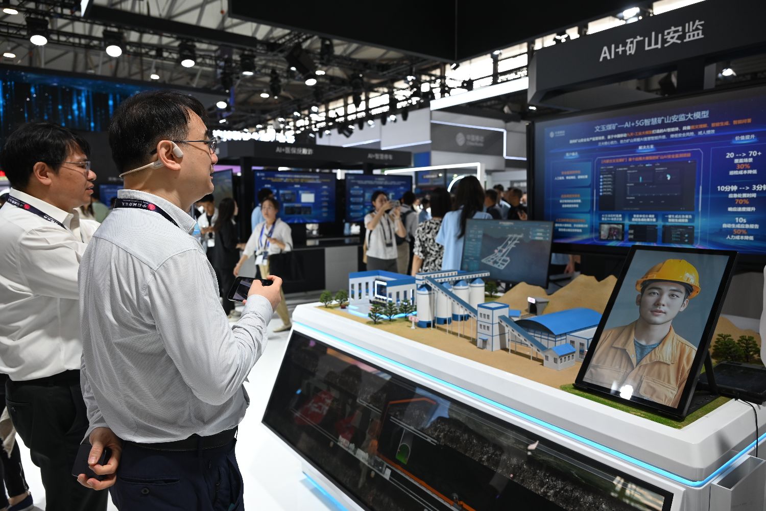6月18日,观众在中国移动展台了解“AI+矿山安监”技术方案。(图片来源:本文图片均据新华社)