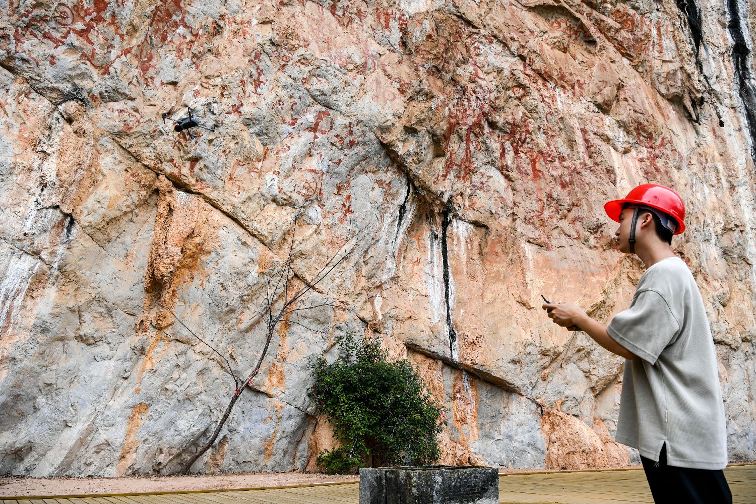 宁明县位于广西西南边陲,现存有多处岩画,其中一处是左江流域面积最大的单体涂绘类岩画,面积约8000多平方米,可辨识图像约1900多个,涉及正身人像、侧身人像、铜鼓图像、渡船图像等,具有极高的艺术价值和文化价值。历经两千余年的风雨侵蚀等自然力的破坏,部分岩画不可避免地出现了风化溶蚀,有的甚至已从岩体脱落。1984年,宁明县成立文物管理所,此后持续对岩画实施保护管理。2015年5月,花山岩画历时5年完成了岩画本体抢救性修复保护工程,出现风化、开裂等问题的岩画均得到有效加固和修复。图为工作人员使用无人机对岩壁进行拍照。(图片来源:本文图片均据新华社)