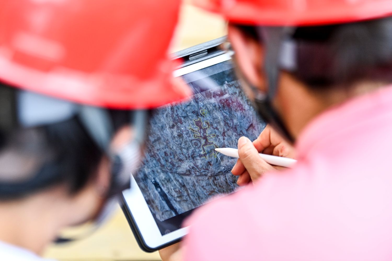 当地不断完善岩画监测预警体系建设,强化对花山岩画本体及周边环境的监测、监控和预警,建立花山岩画保护监测站,不间断值班和定期巡查成为日常。通过运用高科技手段,将花山岩画的影像数字化,实现了岩体裂隙、温度、湿度等监测数据实时与国家文物局数据监测平台无缝连接,确保了岩画的安全保存。目前,花山岩画已开展16个保护工程项目和课题研究项目。图为工作人员对数字岩画进行补全。